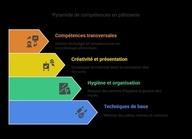 Hygiène et organisation : respecter les normes d’hygiène (plan HACCP) et gérer l’approvisionnement. Par exemple, il apprend à « vérifier la mise en place du poste de travail » et à « constituer et entretenir des réseaux commerciaux ». Une bonne organisation du poste et du timing de cuisson est essentielle en pâtisserie.