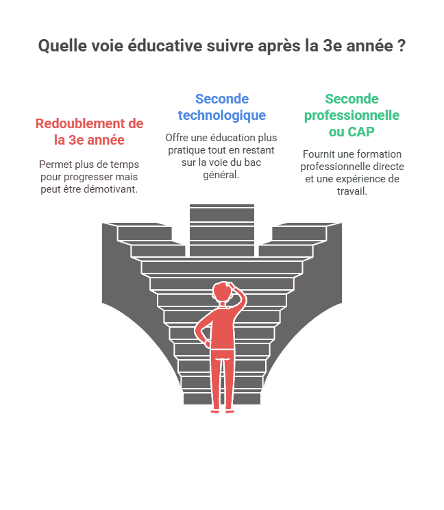 | Maintien en 3ᵉ (redoublement) | Refuser la 2de et rester une année supplémentaire en 3ᵉ | Donne du temps pour progresser ou réfléchir à un projet | Peut démotiver l’élève, année répétitive si pas de projet |